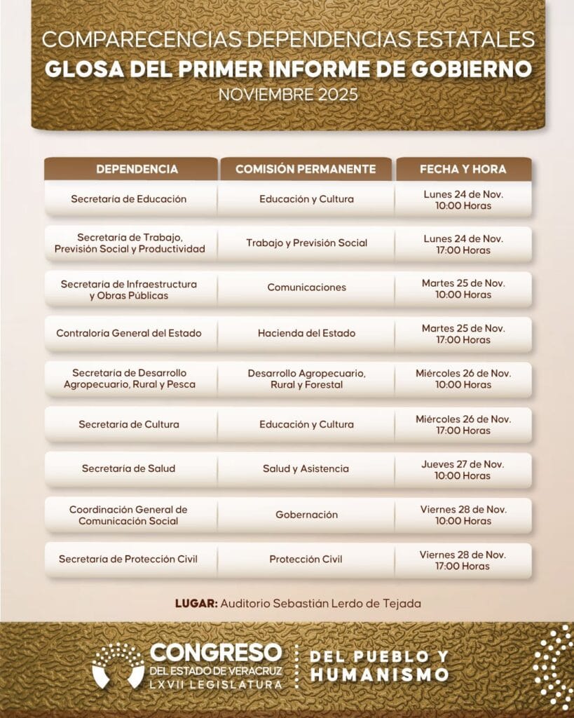 Xalapa, Ver., 06 de noviembre de 2025.- Con motivo de la Glosa del Primer Informe de Gobierno sobre el estado que guarda la Administración Pública Estatal, el Pleno de la LXVII Legislatura del estado aprobó el calendario de comparecencias de las secretarias y los secretarios de despacho o equivalentes del Poder Ejecutivo estatal, cuyo periodo abarcará del martes 18 al viernes 28 de noviembre de la presente anualidad.